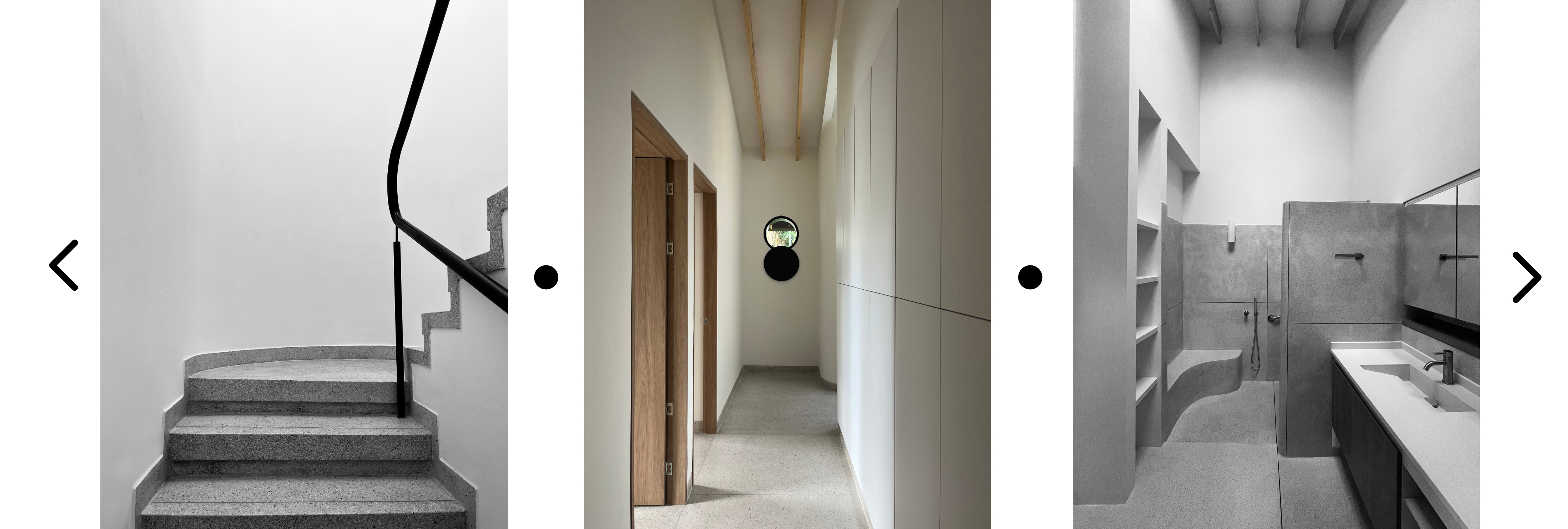 El proyecto se inscribe en un cuadrado en el centro de la parcela; hacia el costado nororiente, el corredor exterior en forma de L da paso a los accesos de la casa. Al interior, tres bloques conforman el primer nivel; el bloque social de cocina y sala, seguido por un bloque central que contiene la zona de baños y la conexión a la zona de servicios en el nivel inferior, y el bloque más privado que da a las habitaciones. En la parte central la escalera conduce al nivel inferior contiene la zona de servicios: lavandería, despensa, depósito y máquinas.